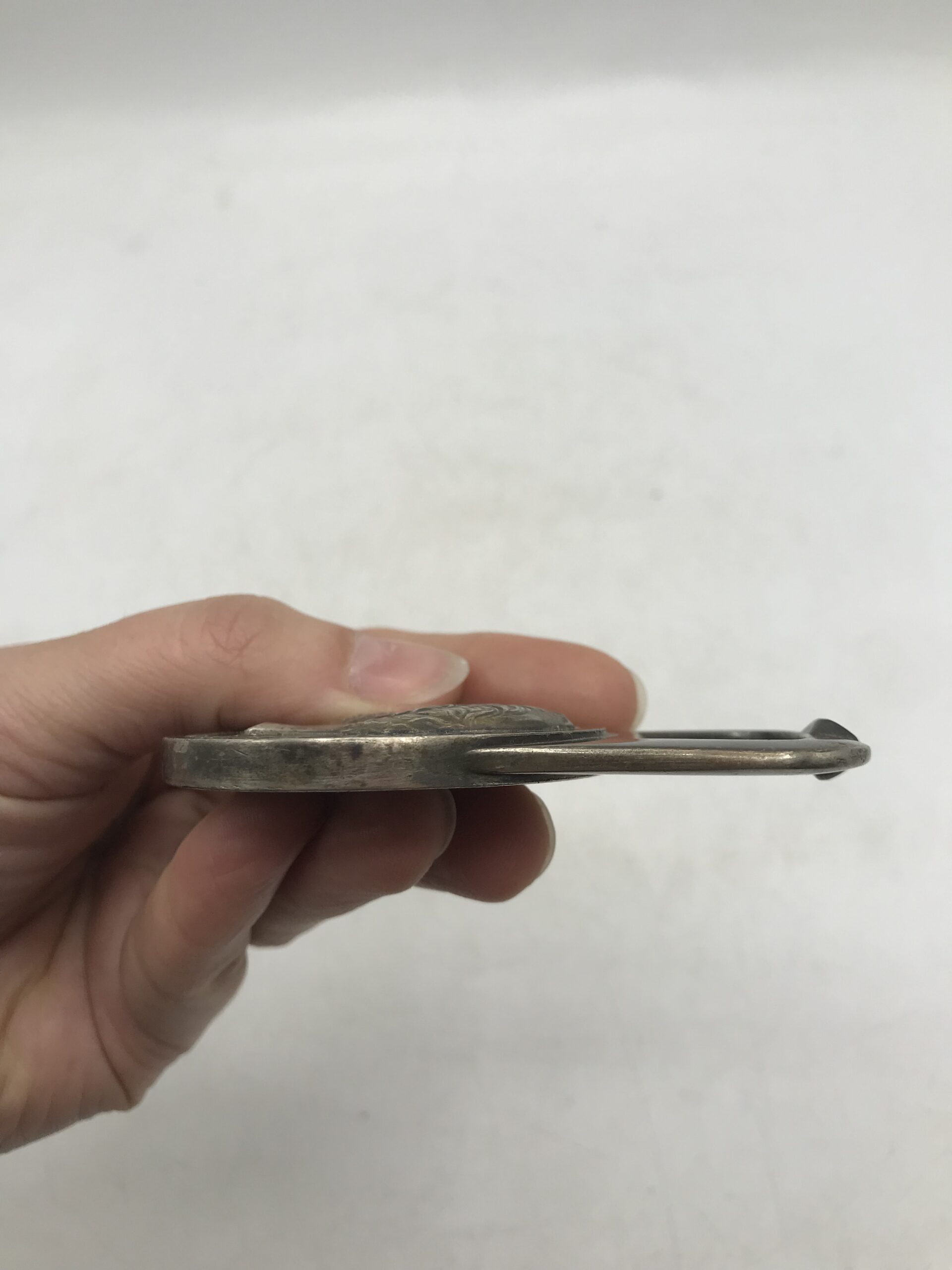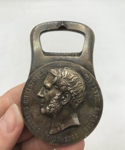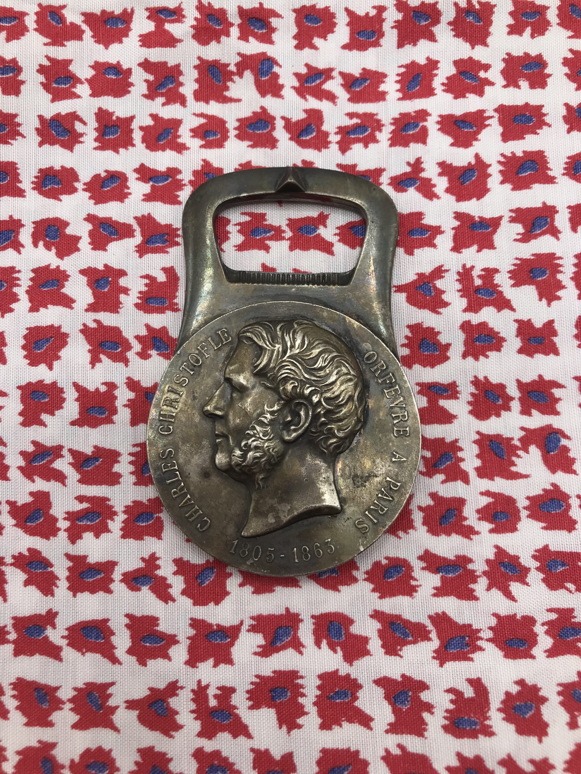 Décapsuleur Charles Christofle. Magnifique décapsuleur en métal argenté. Il est en bon état mais un petit coup de propre lui fera du bien. Sur la première face nous voyons le visage de Charles Christofle en 3d, et y est noté Charles Christofle orfèvre à Paris 1805-1863. Sur la deuxième face nous voyons une couronne végétale accompagnée d’une petite abeille et de l’annotation maveltex s.a. Une bel objet ancien qui ne manquera pas de trouver sa place sur votre table. Un plus si vous avez de l’argenterie celui ci se mariera formidablement à l’ensemble. Amateurs d’objets anciens soyez au rdv.