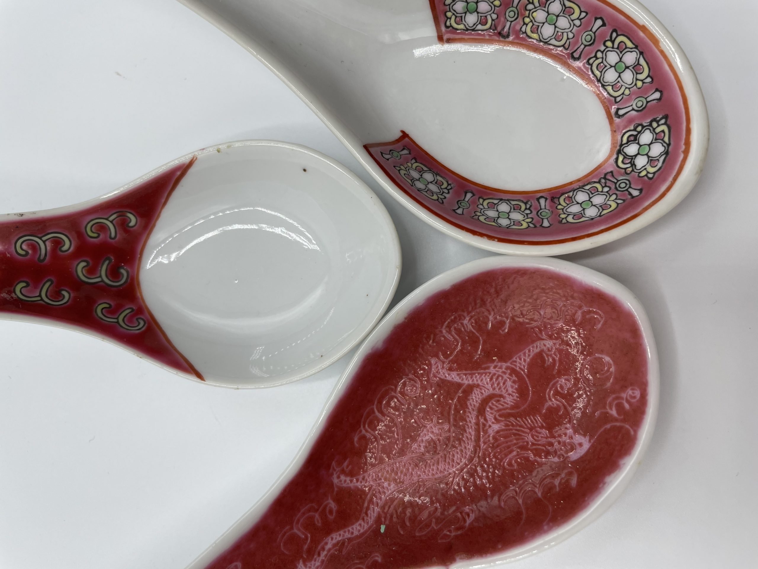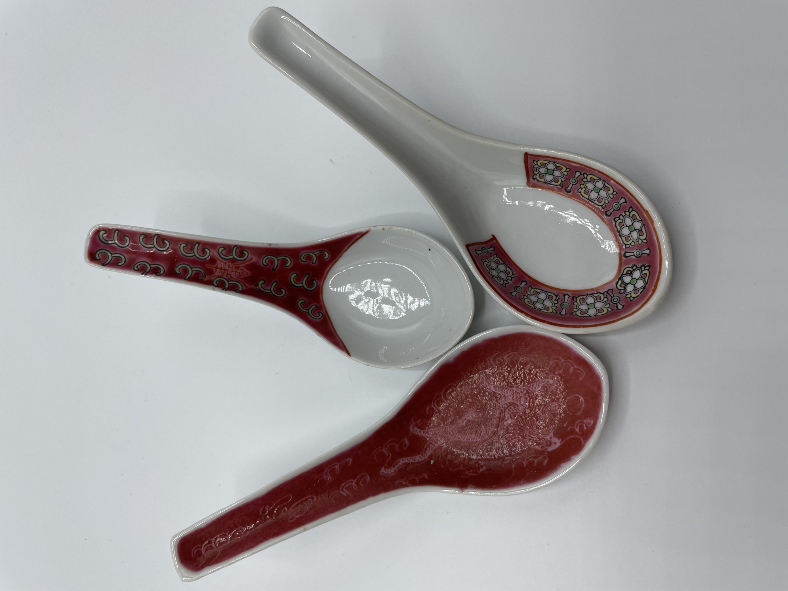 Joli lot de 3 cuillères à soupe chinoises rouges dépareillées. Le lot est composé de 3 cuillères de taille classiques, en céramique peu communes. Une entièrement rouge avec un motif de dragon, une avec le manche rouge incrusté de motif traditionnels, et une avec des motifs de fleurs. Les cuillères sont peintes à la main et sont donc des pièces uniques! A la différence des cuillères occidentales, le fond plat et profond des cuillères chinoises, assure une plus grande contenance et correspond en outre à une gorgée de soupe.